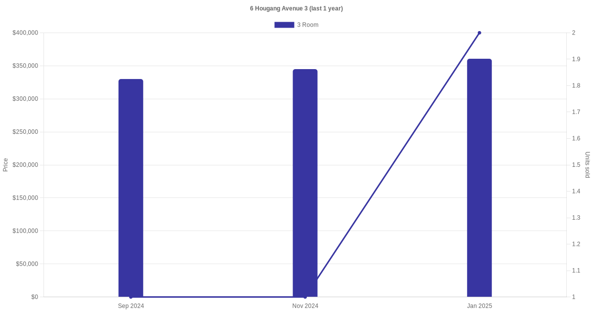 Below is a quick summary of the resale transactions volume and average price trends for the 3 room units at 6 Hougang Avenue 3.