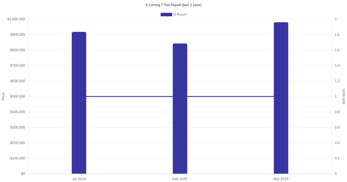 | Mar 2025 | $980,000 | $8,099 | 5 Room | Blk 6 Lorong 7 Toa Payoh 5 Room / 121 sqm | 25 to 27 | 121 sqm | Improved | 1998 |