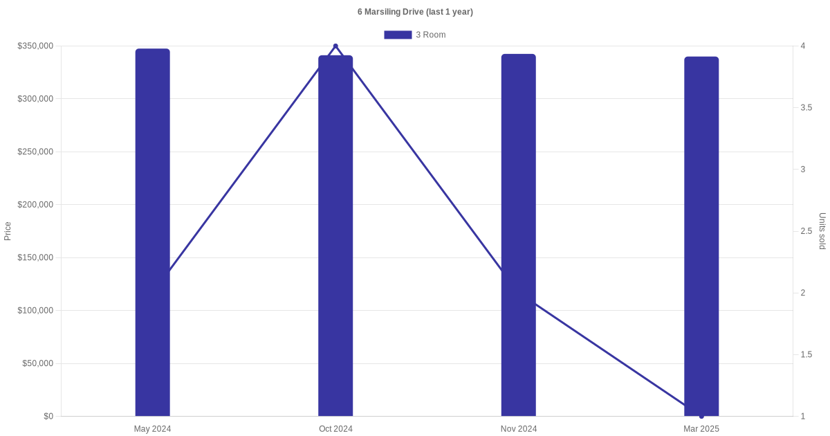 Below is a quick summary of the resale transactions volume and average price trends for the 3 room units at 6 Marsiling Drive.