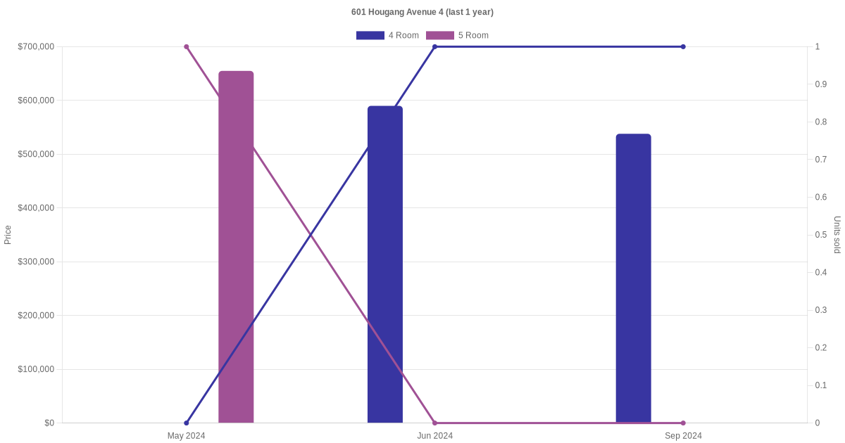 Below is a quick summary of the resale transactions volume and average price trends for the 4 room and 5 room units at 601 Hougang Avenue 4.
