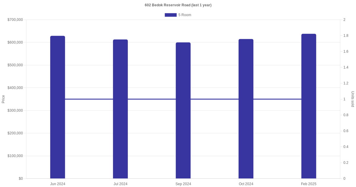 Below is a quick summary of the resale transactions volume and average price trends for the 4 room and 5 room units at 602 Bedok Reservoir Road.