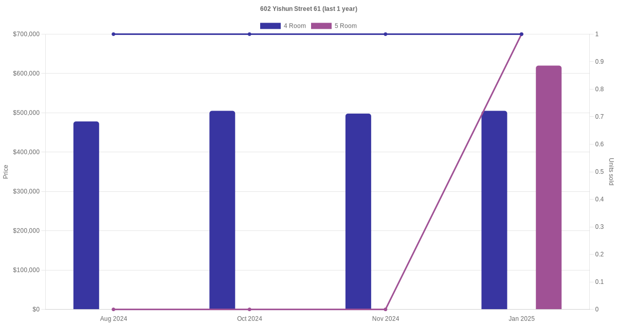 Below is a quick summary of the resale transactions volume and average price trends for the 4 room and 5 room units at 602 Yishun Street 61.