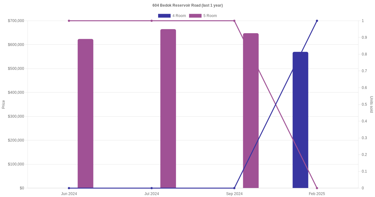 Below is a quick summary of the resale transactions volume and average price trends for the 4 room and 5 room units at 604 Bedok Reservoir Road.