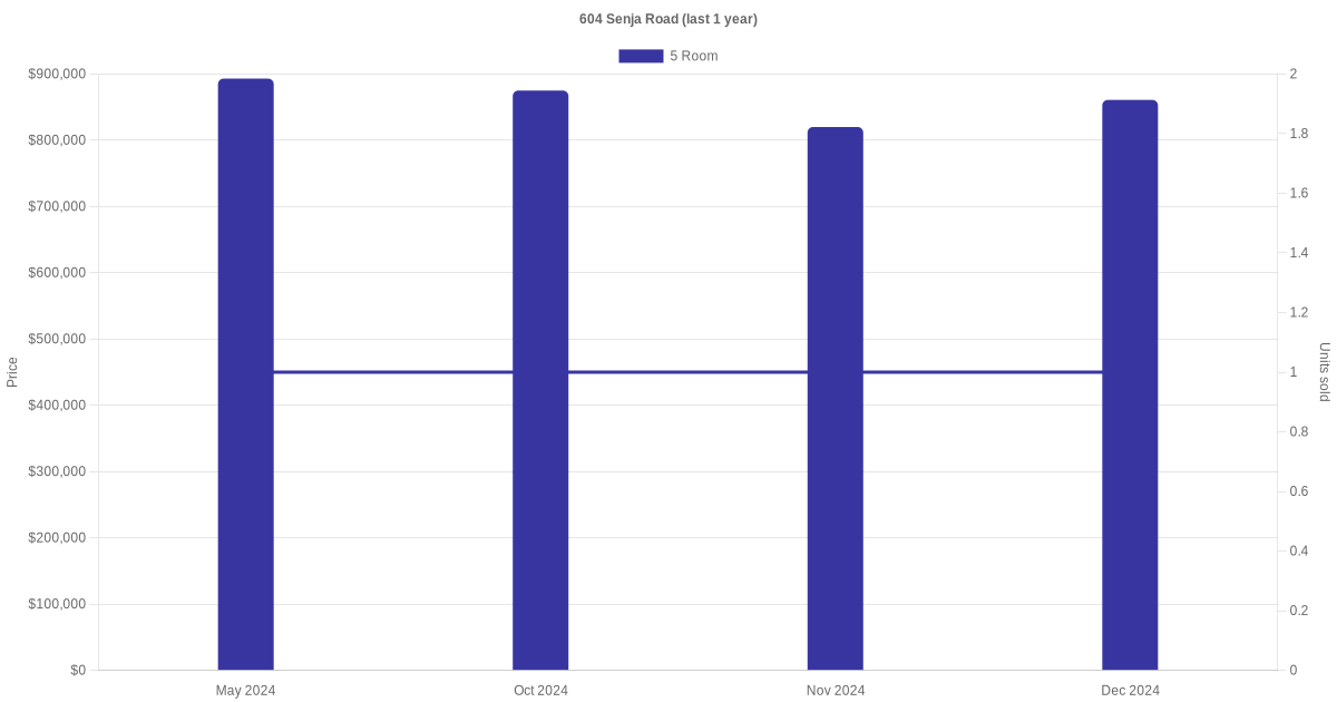 Below is a quick summary of the resale transactions volume and average price trends for the 4 room and 5 room units at 604 Senja Road.