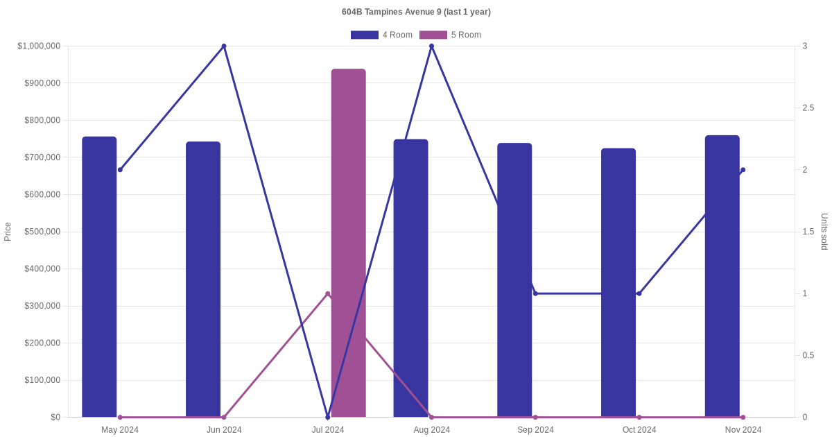 Below is a quick summary of the resale transactions volume and average price trends for the 4 room and 5 room units at 604B Tampines Avenue 9.