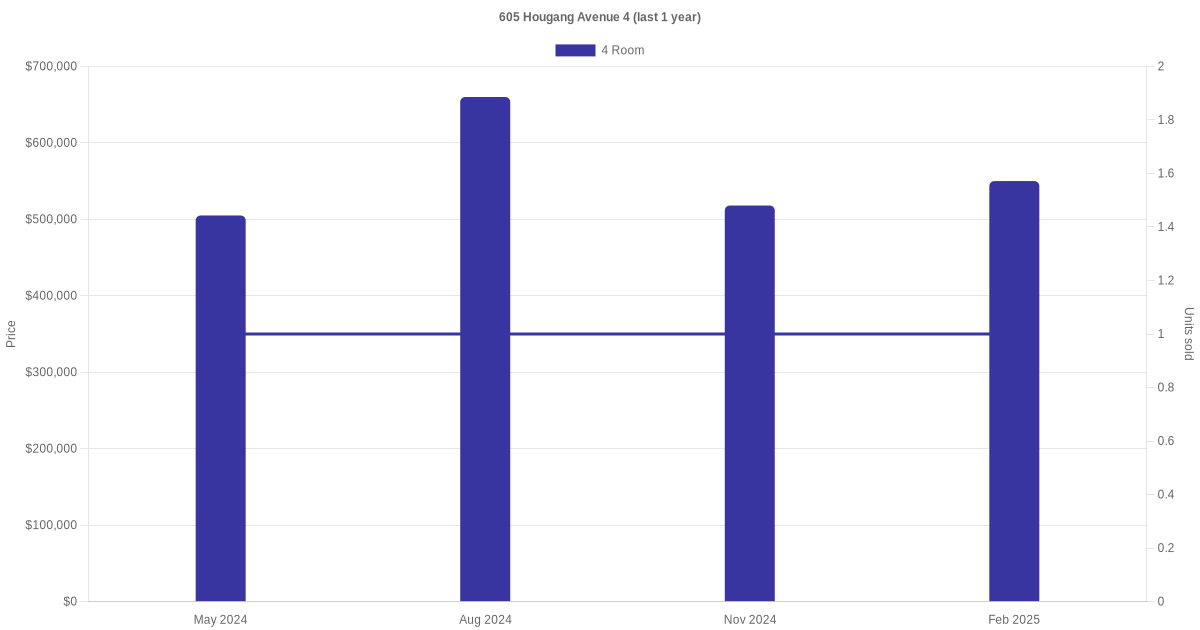 Below is a quick summary of the resale transactions volume and average price trends for the 4 room units at 605 Hougang Avenue 4.