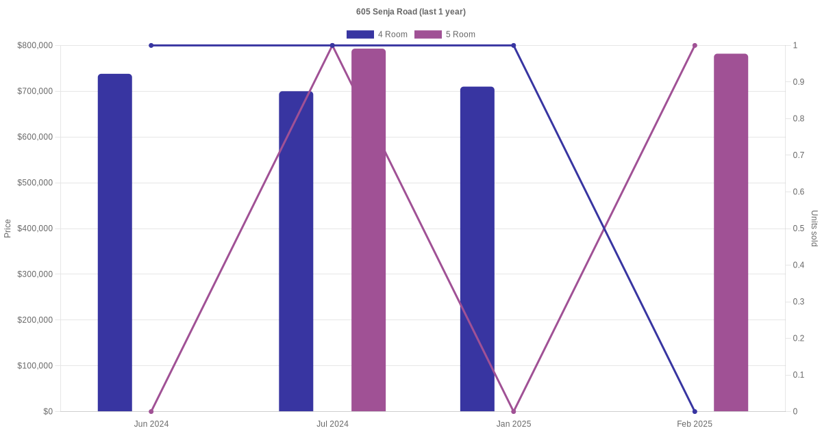 Below is a quick summary of the resale transactions volume and average price trends for the 4 room and 5 room units at 605 Senja Road.