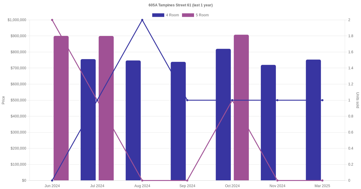 Below is a quick summary of the resale transactions volume and average price trends for the 4 room and 5 room units at 605A Tampines Street 61.