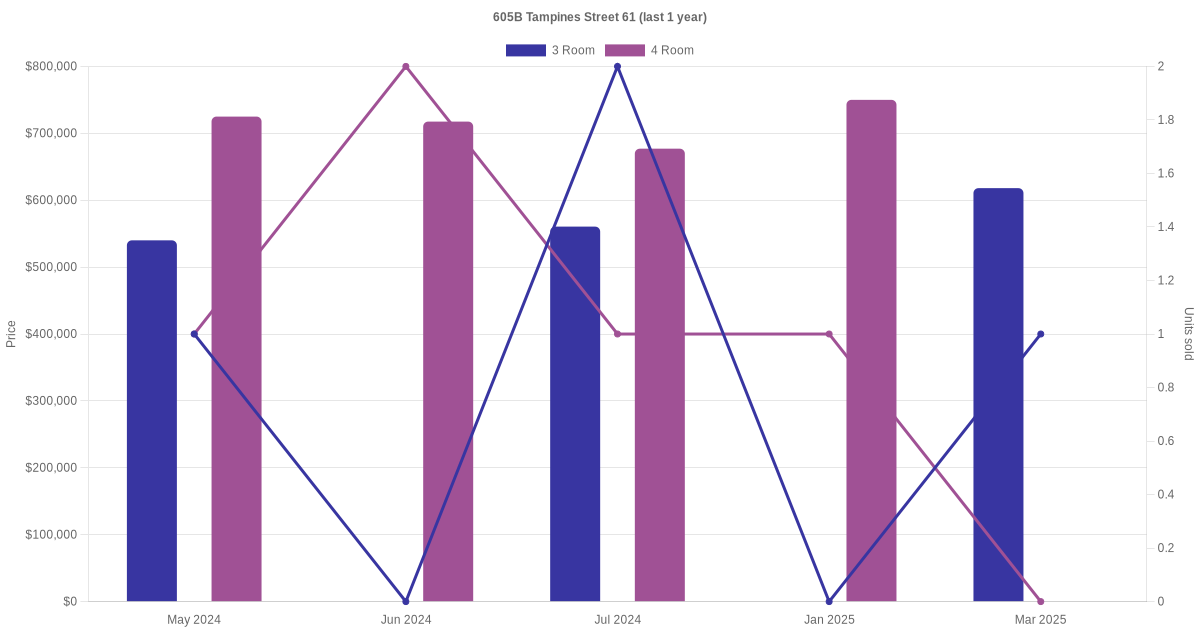 Below is a quick summary of the resale transactions volume and average price trends for the 3 room and 4 room units at 605B Tampines Street 61.
