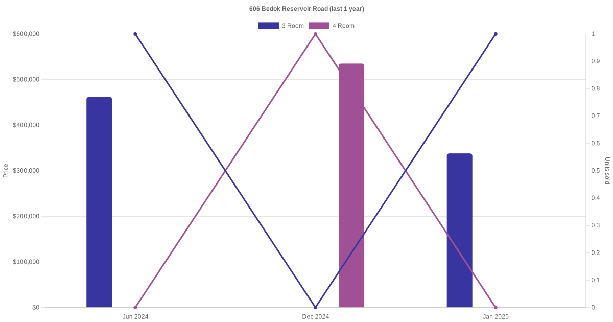 Below is a quick summary of the resale transactions volume and average price trends for the 3 room and 4 room units at 606 Bedok Reservoir Road.