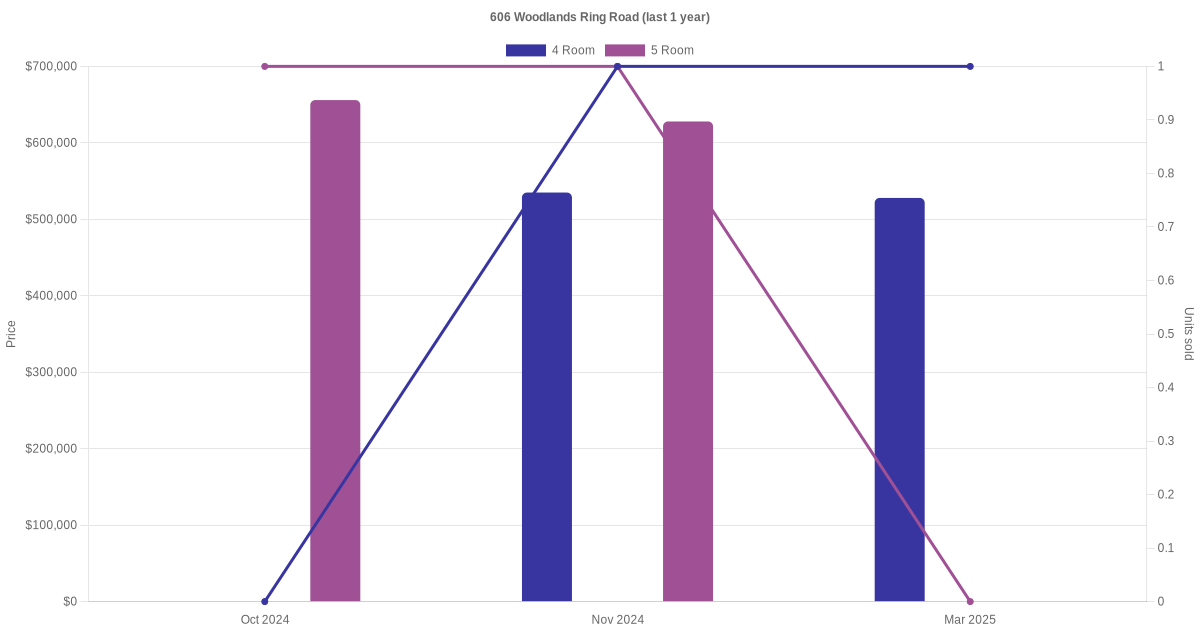 Below is a quick summary of the resale transactions volume and average price trends for the 4 room and 5 room units at 606 Woodlands Ring Road.