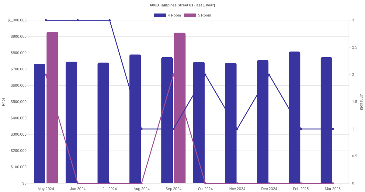 Below is a quick summary of the resale transactions volume and average price trends for the 4 room and 5 room units at 606B Tampines Street 61.