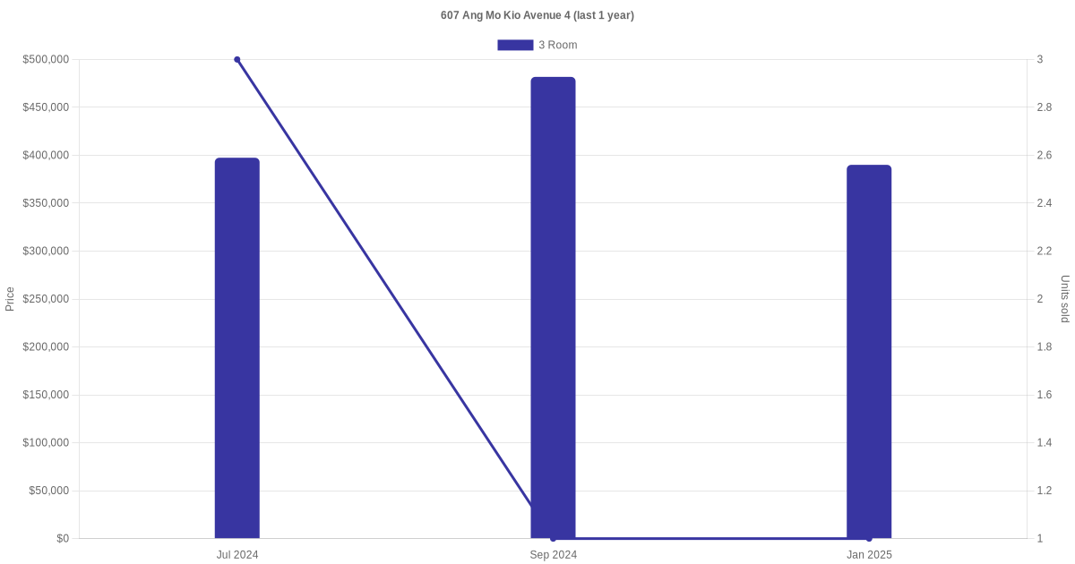 Below is a quick summary of the resale transactions volume and average price trends for the 3 room units at 607 Ang Mo Kio Avenue 4.