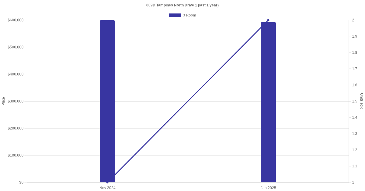 Below is a quick summary of the resale transactions volume and average price trends for the 3 room and 4 room units at 609D Tampines North Drive 1.