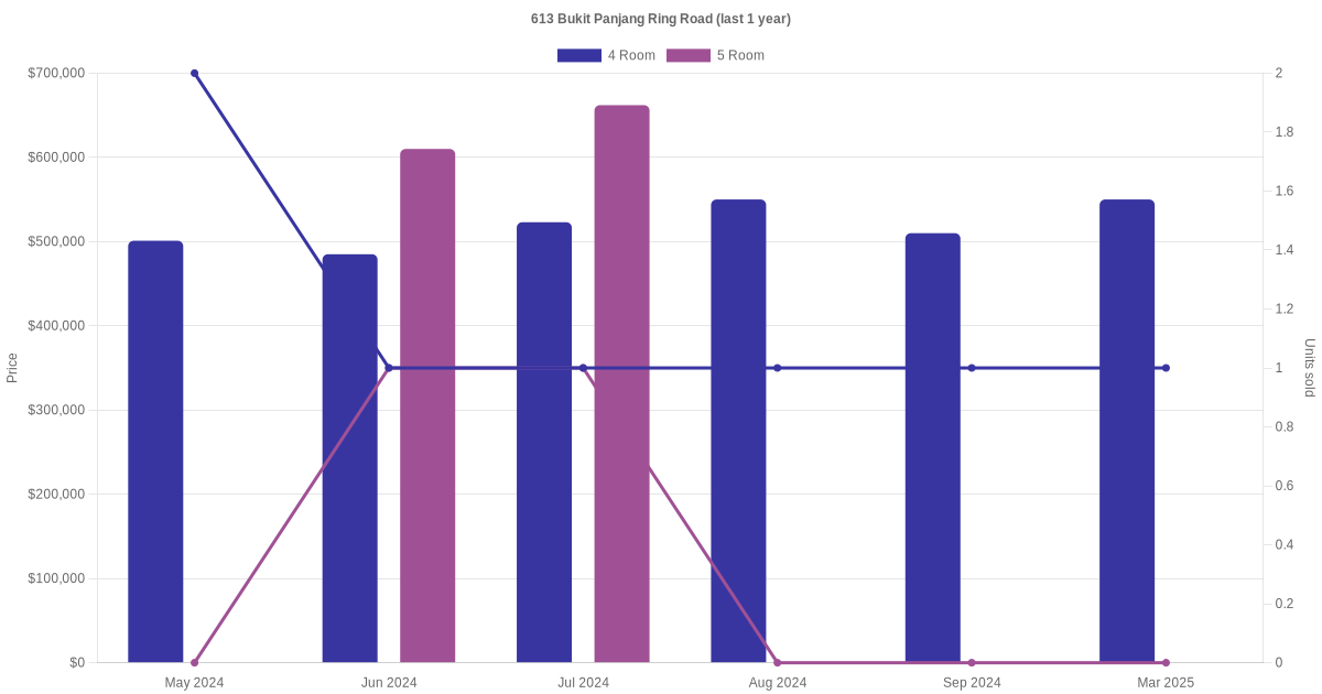 Below is a quick summary of the resale transactions volume and average price trends for the 4 room and 5 room units at 613 Bukit Panjang Ring Road.