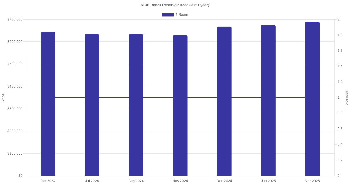 Below is a quick summary of the resale transactions volume and average price trends for the 4 room units at 613B Bedok Reservoir Road.