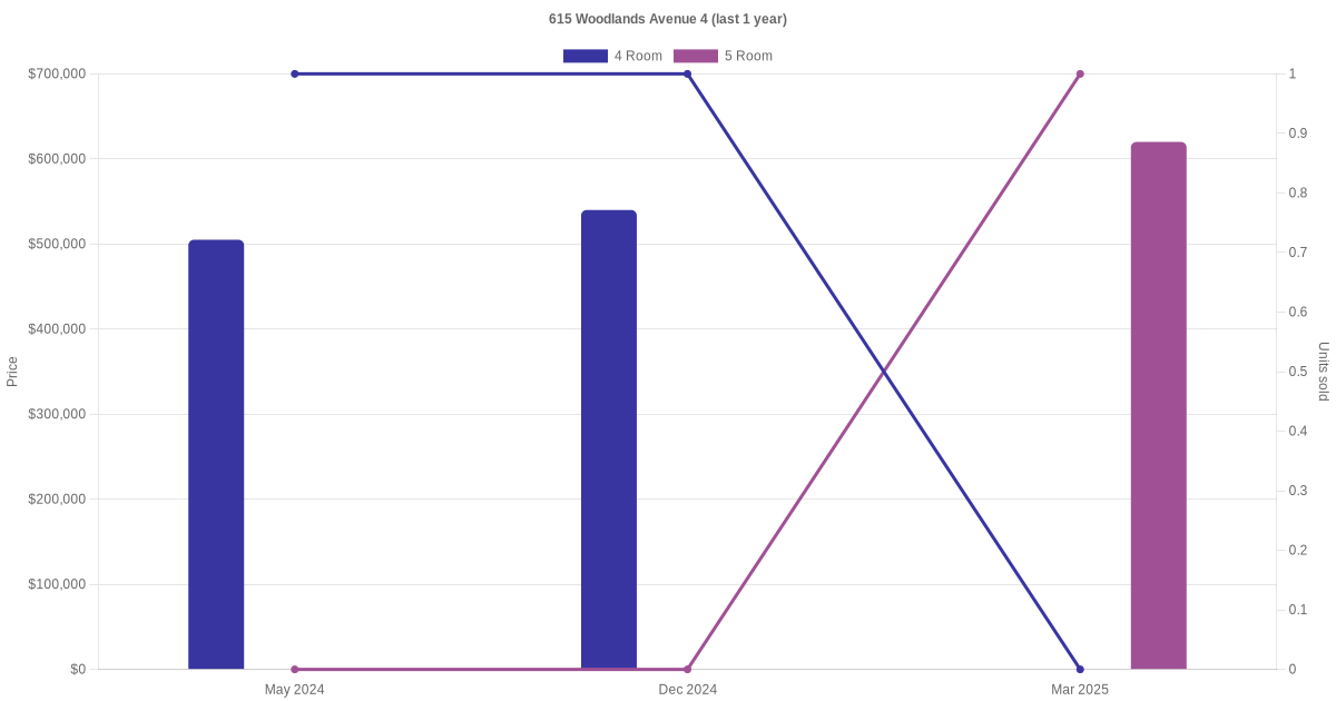 There were a total of 5 resale transactions in the last 3 years for units in block 615 Woodlands Avenue 4, with the latest one recorded in Mar 2025.