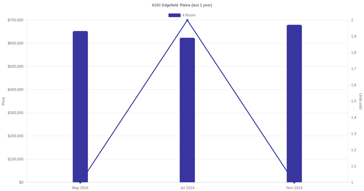 Below is a quick summary of the resale transactions volume and average price trends for the 4 room units at 615C Edgefield Plains.