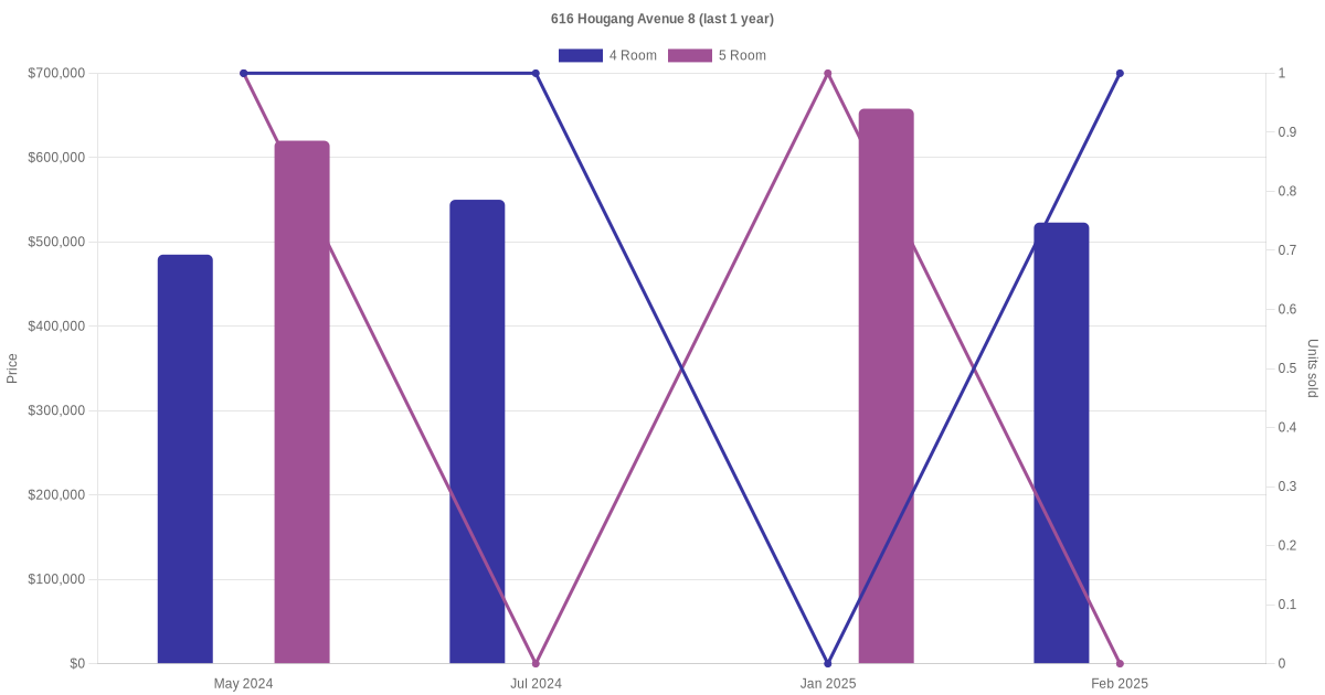 Below is a quick summary of the resale transactions volume and average price trends for the 4 room and 5 room units at 616 Hougang Avenue 8.