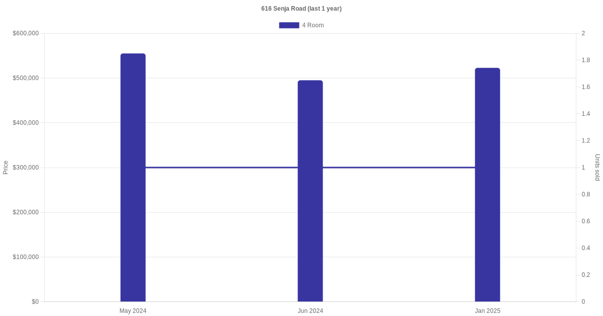 Below is a quick summary of the resale transactions volume and average price trends for the 4 room units at 616 Senja Road.