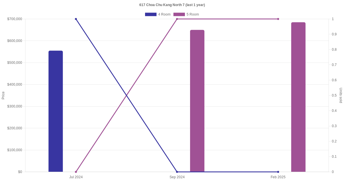 Below is a quick summary of the resale transactions volume and average price trends for the 4 room and 5 room units at 617 Choa Chu Kang North 7.