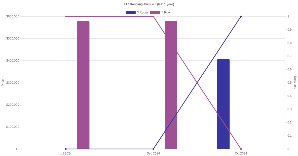 Below is a quick summary of the resale transactions volume and average price trends for the 3 room and 4 room units at 617 Hougang Avenue 8.