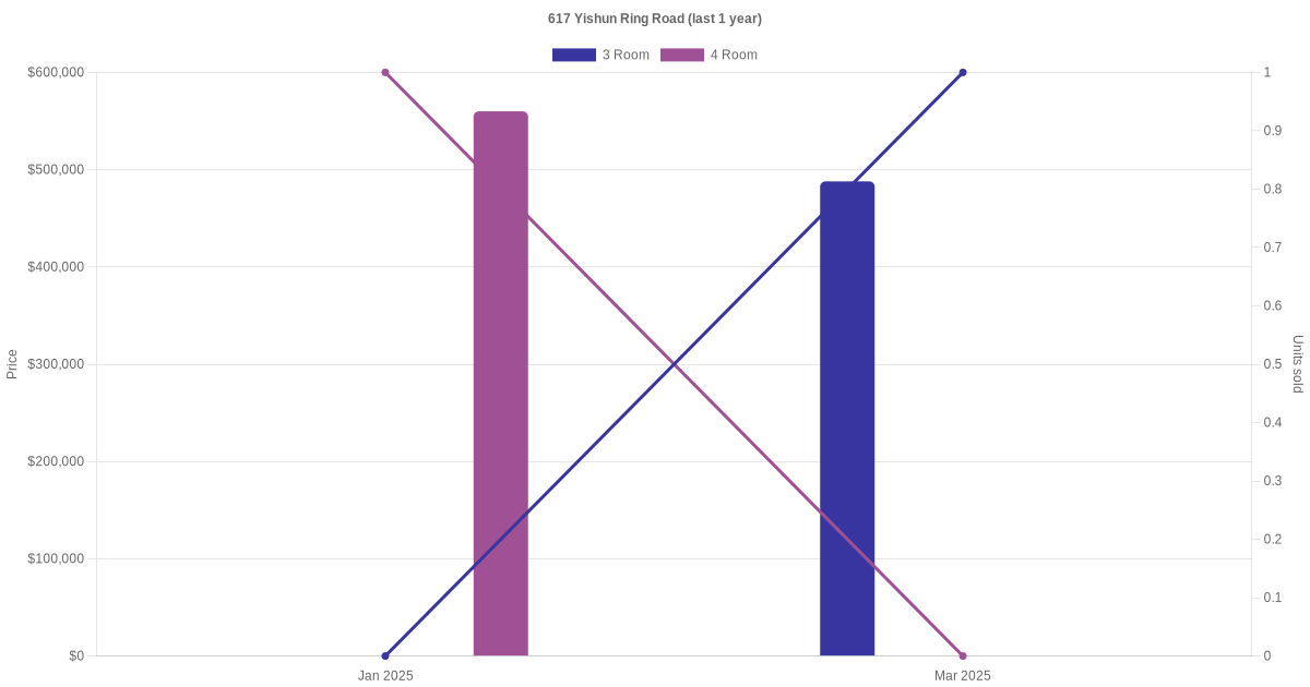 Below is a quick summary of the resale transactions volume and average price trends for the 3 room and 4 room units at 617 Yishun Ring Road.