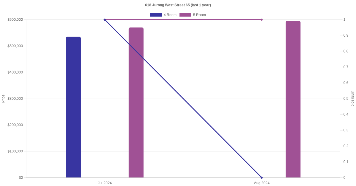Below is a quick summary of the resale transactions volume and average price trends for the 4 room and 5 room units at 618 Jurong West Street 65.