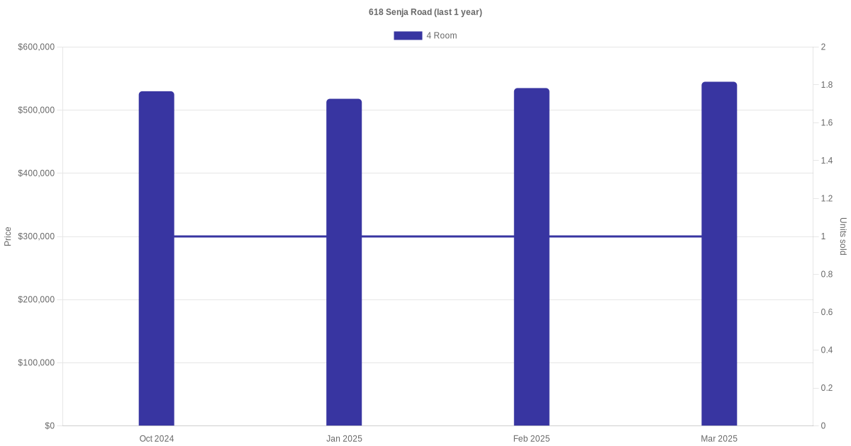 Below is a quick summary of the resale transactions volume and average price trends for the 4 room units at 618 Senja Road.