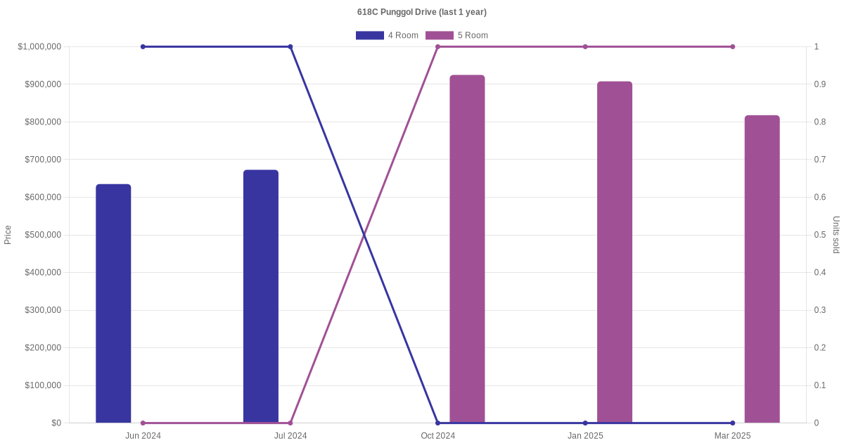 Below is a quick summary of the resale transactions volume and average price trends for the 4 room and 5 room units at 618C Punggol Drive.