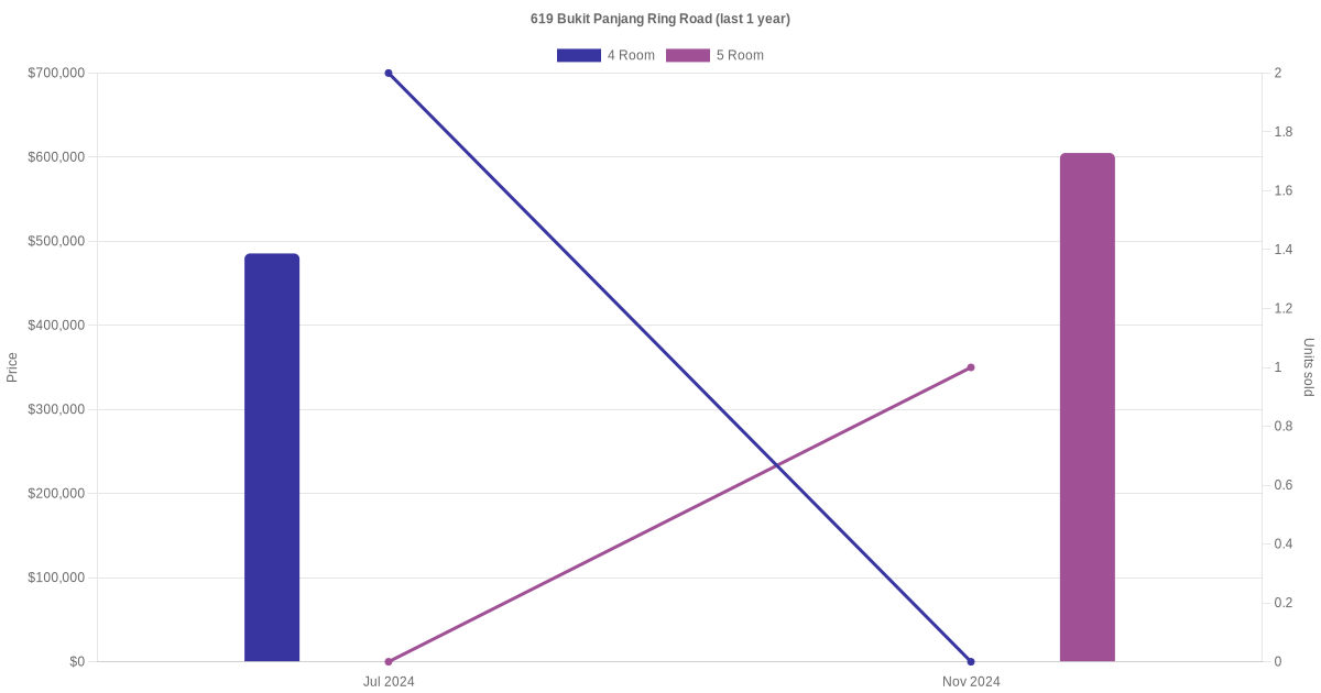 Below is a quick summary of the resale transactions volume and average price trends for the 4 room and 5 room units at 619 Bukit Panjang Ring Road.