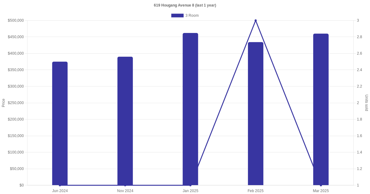Below is a quick summary of the resale transactions volume and average price trends for the 3 room units at 619 Hougang Avenue 8.