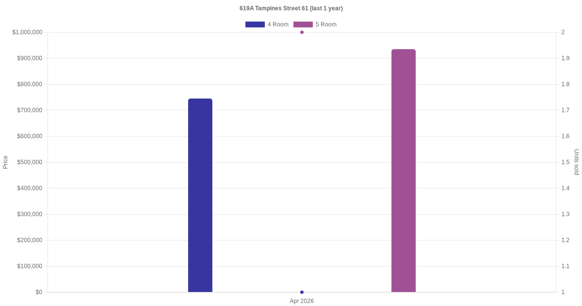 | Apr 2026 | $745,000 | $8,011 | 4 Room | Blk 619A Tampines Street 61 4 Room / 93 sqm | 04 to 06 | 93 sqm | Model A | 2021 |