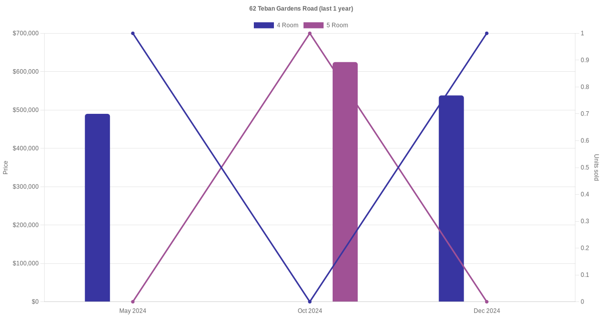 Below is a quick summary of the resale transactions volume and average price trends for the 4 room and 5 room units at 62 Teban Gardens Road.