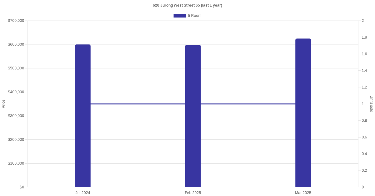 Below is a quick summary of the resale transactions volume and average price trends for the 5 room units at 620 Jurong West Street 65.