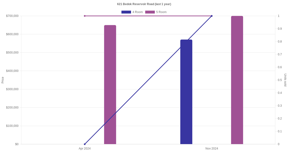 Below is a quick summary of the resale transactions volume and average price trends for the 4 room and 5 room units at 621 Bedok Reservoir Road.