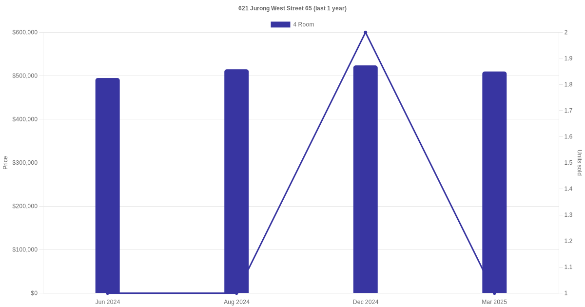 Below is a quick summary of the resale transactions volume and average price trends for the 4 room units at 621 Jurong West Street 65.