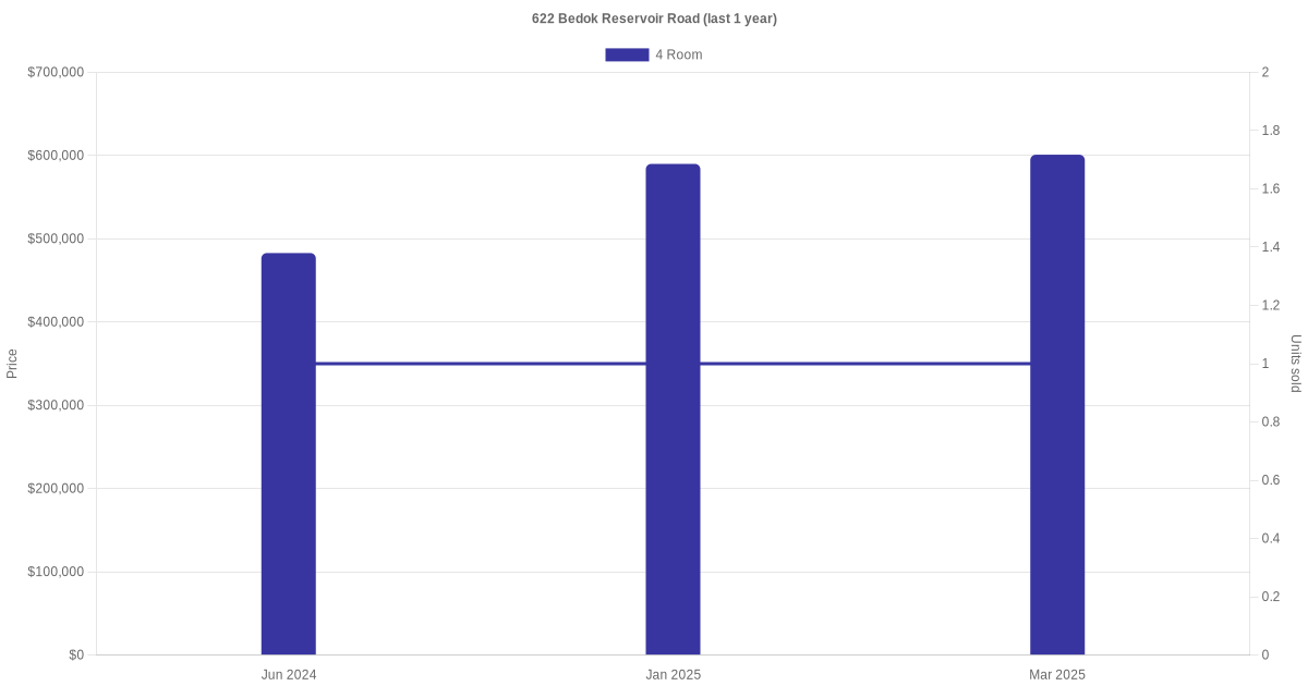 Below is a quick summary of the resale transactions volume and average price trends for the 4 room units at 622 Bedok Reservoir Road.