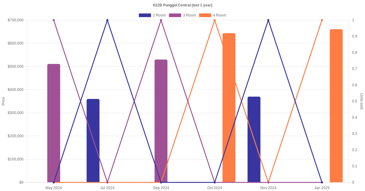 Here's a summary of the rental transactions and price trends for the 2 room, 3 room and 4 room units at 622B Punggol Central.