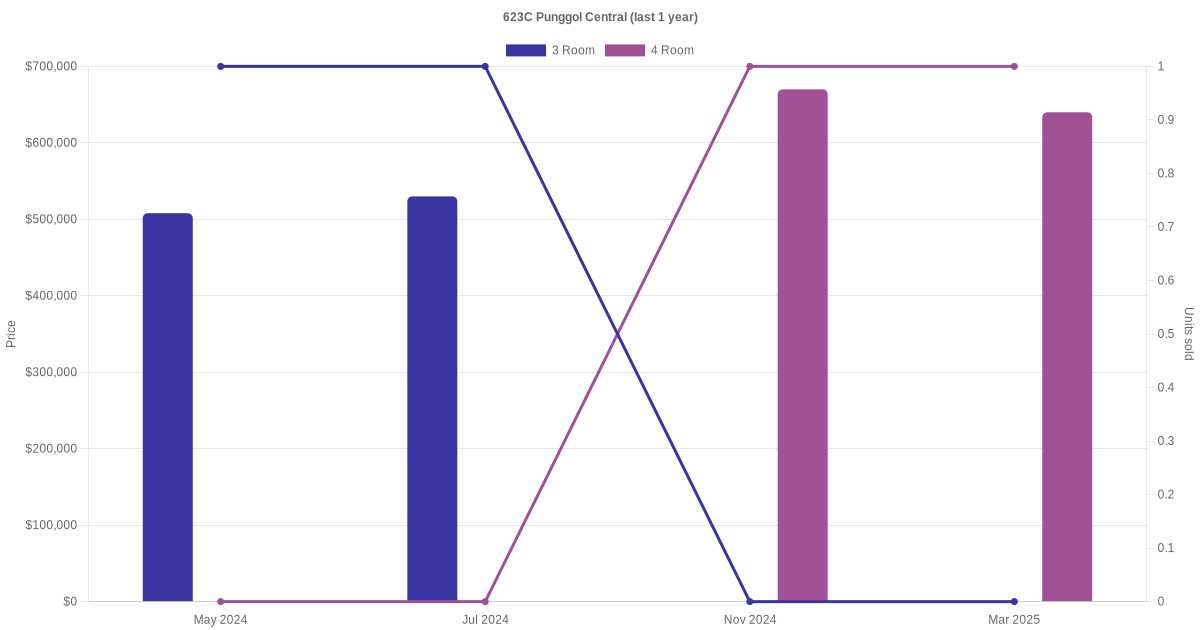 Here's a summary of the rental transactions and price trends for the 2 room, 3 room and 4 room units at 623C Punggol Central.