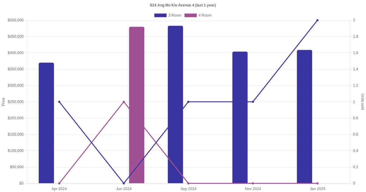 Below is a quick summary of the resale transactions volume and average price trends for the 3 room and 4 room units at 624 Ang Mo Kio Avenue 4.