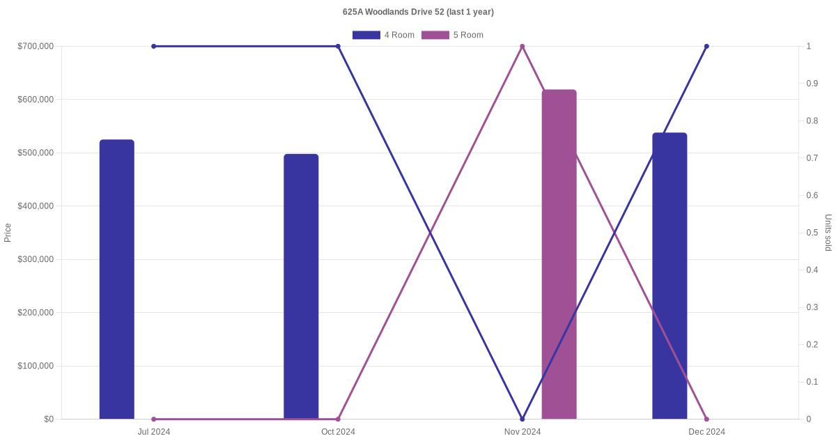 Below is a quick summary of the resale transactions volume and average price trends for the 4 room and 5 room units at 625A Woodlands Drive 52.