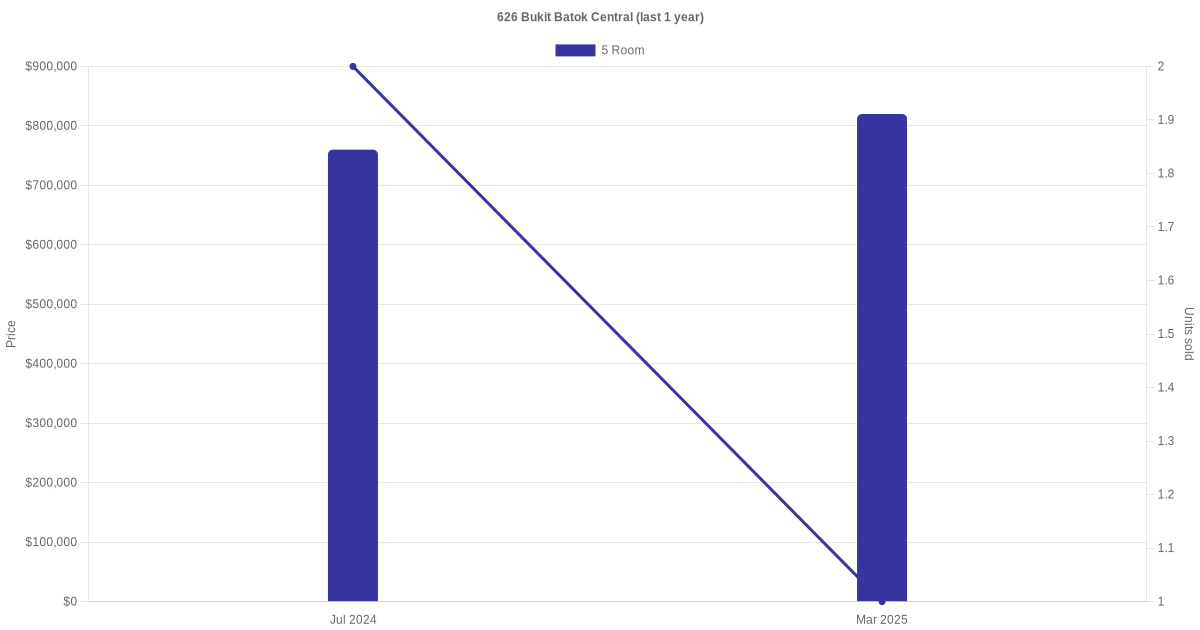 Below is a quick summary of the resale transactions volume and average price trends for the 4 room and 5 room units at 626 Bukit Batok Central.
