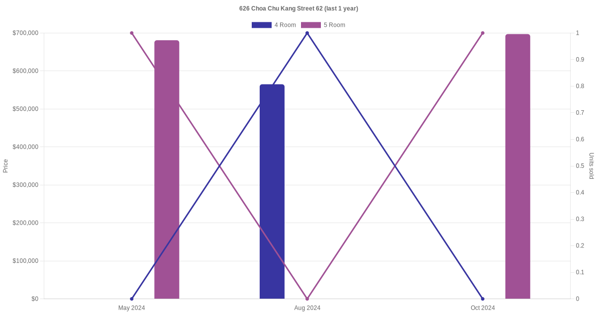 Below is a quick summary of the resale transactions volume and average price trends for the 4 room and 5 room units at 626 Choa Chu Kang Street 62.