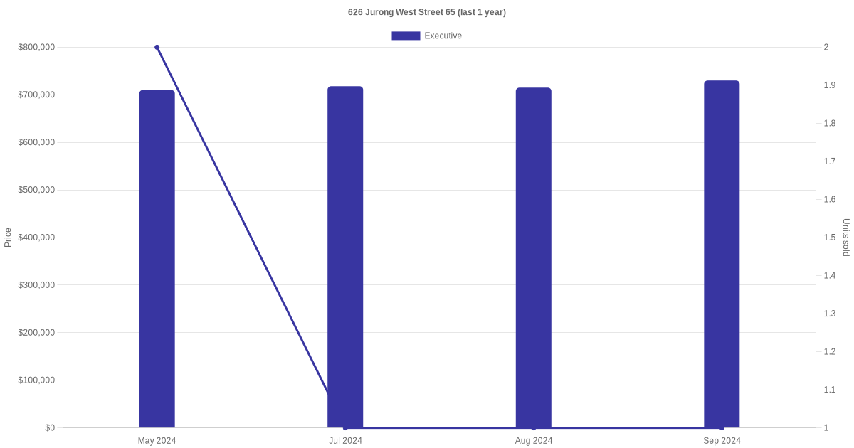 Below is a quick summary of the resale transactions volume and average price trends for the executive units at 626 Jurong West Street 65.