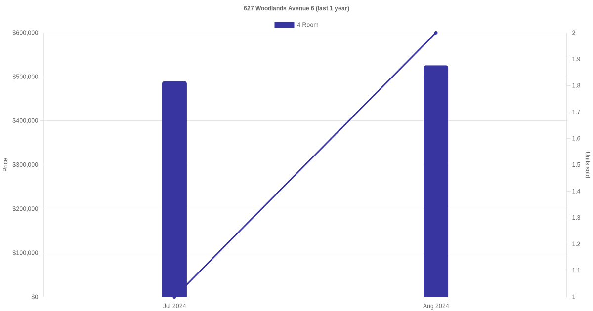 Below is a quick summary of the resale transactions volume and average price trends for the 4 room units at 627 Woodlands Avenue 6.