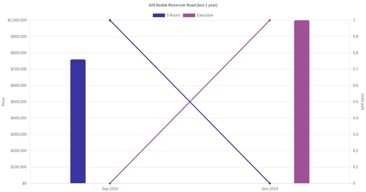 Below is a quick summary of the resale transactions volume and average price trends for the 5 room and executive units at 629 Bedok Reservoir Road.