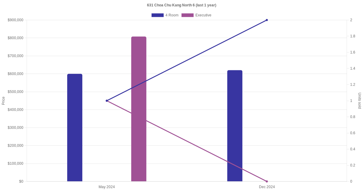 Below is a quick summary of the resale transactions volume and average price trends for the 4 room and executive units at 631 Choa Chu Kang North 6.