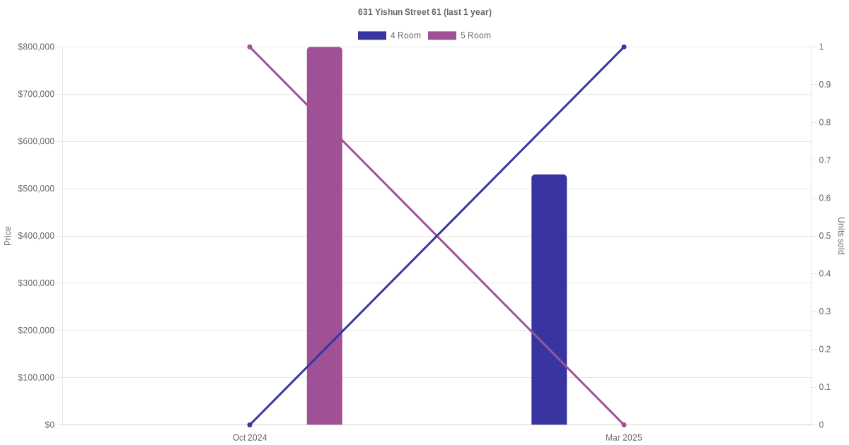 Below is a quick summary of the resale transactions volume and average price trends for the 4 room, 5 room and executive units at 631 Yishun Street 61.