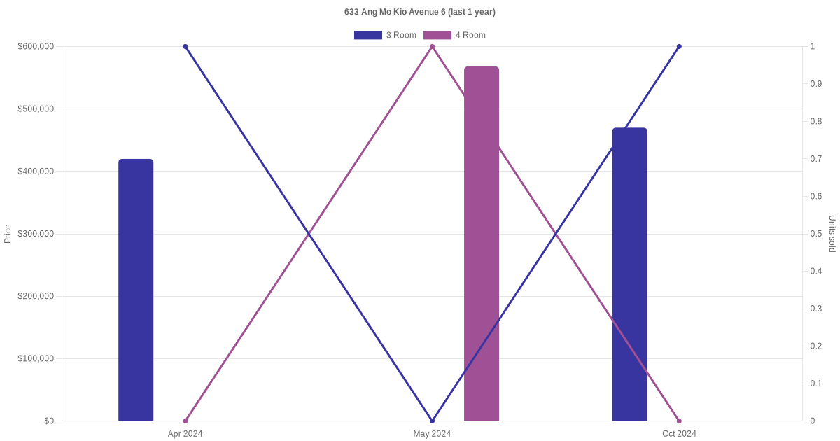 Below is a quick summary of the resale transactions volume and average price trends for the 3 room and 4 room units at 633 Ang Mo Kio Avenue 6.